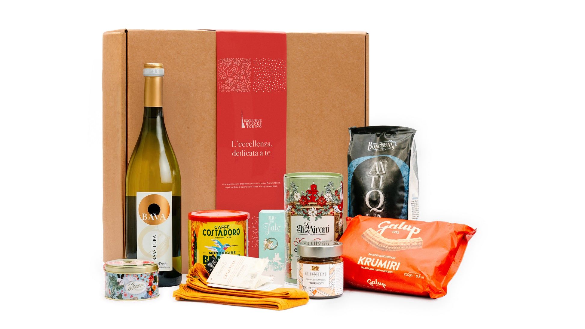 Un'esclusiva confezione regalo con una selezione dei migliori prodotti dei retisti di Exclusive Brands Torino. Questa box, curata con amore da Exclusive Brands Torino, è un tributo alla tradizione del territorio.